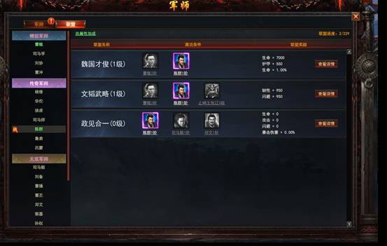 军师界面中点击联盟可以看到激活军师可以增加角色属性,查看详情可以了解每一位军师需要激活军师联盟的条件。