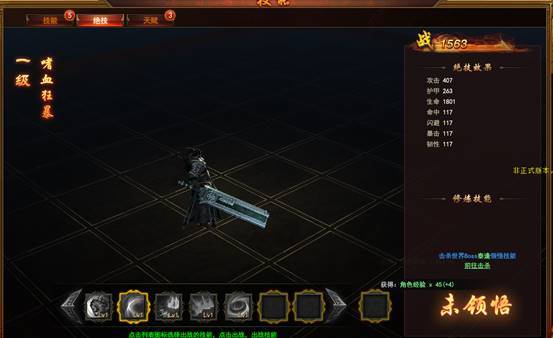 绝技界面包含人物绝技的介绍、效果、动态、属性加成。绝技可通过参与击杀世界Boss获得,击杀不同世界Boss获得对应的绝技。绝技是击杀世界Boss后获得强力技能十分稀有。