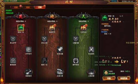 天赋技能为五个一组的技能树,共有三组,每组增加的属性效果各不相同,技能树中前四个为增加人物属性的被动技能,最后一个为攻击时触发效果的技能。
