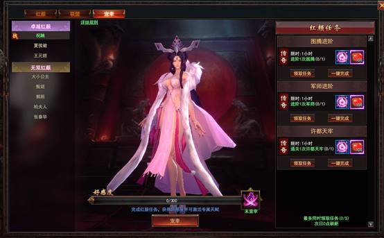 红颜界面中点击宠幸可以看到每个红颜可以领取三个任务(红颜),完成后可以获得好感度以及奖励,好感度满后手动激活红颜专属天赋,红颜之间的专属天赋是无法同时激活哦。
