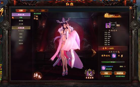 在红颜右下角升级按钮可以消耗红颜进阶丹进行升级可以提升红颜属性,当然红颜也分为无双以及卓越,无双红颜也更加优秀~。