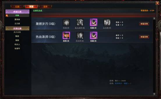 红颜界面中点击联盟可以看到激活红颜可以增加角色属性,查看详情可以了解每一位红颜需要激活联盟的条件。