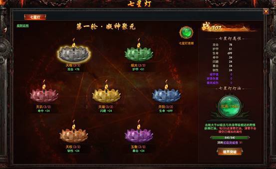 七星灯界面右下角注入灯油按钮,大侠们可以选择对应七星灯进行注入灯油,也会获得七星灯相对应的属性。灯油是通过击杀60级及以上的野怪和魏王疑冢内怪物可以获得,每日0点会重置未被消耗的灯油哦。当七星灯境界值满之后是需要进行境界突破,突破下一重之后,重置并增加注入灯油上限次数继续修炼。