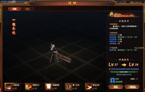 技能界面包含角色技能的详细信息,技能介绍、技能等级、技能动态、技能效果。技能升级需要消耗“精力”,“精力”可通过主线和支线任务获得除此之外还可通过“攻城略地”玩法获得。技能界面中是游戏角色的基础技能,角色基础技能共有五个。